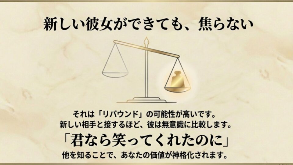 不安になるのは当然ですが、焦りは禁物です。もし彼が新しい女性を作ったとしても、それは彼の人生の経験であり、あなたとの絆を否定するものではありません。むしろ、他の女性を知ることで「やっぱり君が一番だった」と確信させる材料になると捉えてください。今、あなたが無理に連絡をして「面倒な女」の記憶を上書きする方が、復縁の可能性を著しく下げてしまいます。