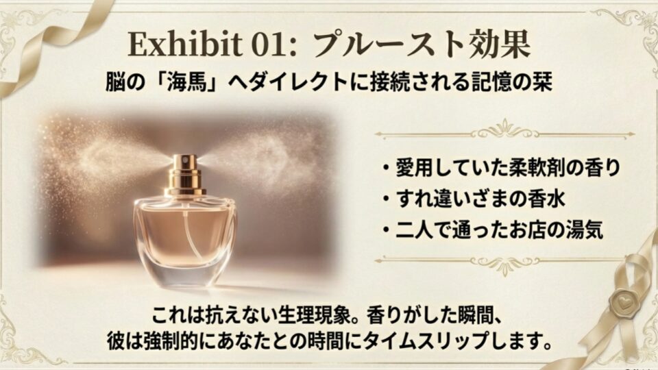 街中でふとあなたと同じ香水の人とすれ違った瞬間、彼の脳内ではタイムスリップが起きます。これは抗えない生理現象です。