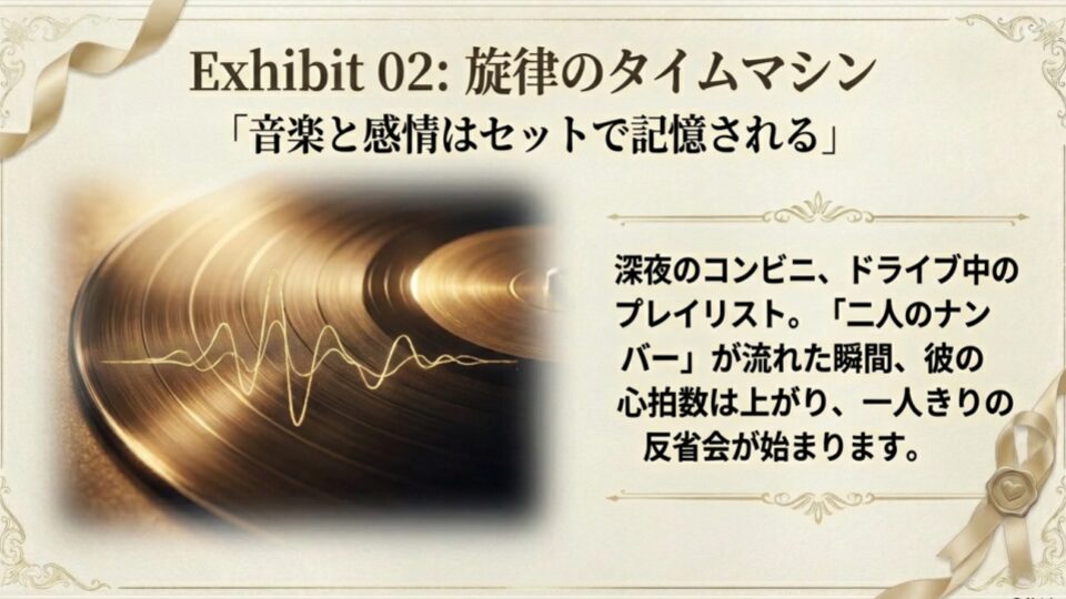 一緒にドライブした時に流れていた曲。深夜、コンビニの有線でそのイントロが流れた瞬間、彼の心臓は少しだけ速く脈打ちます。