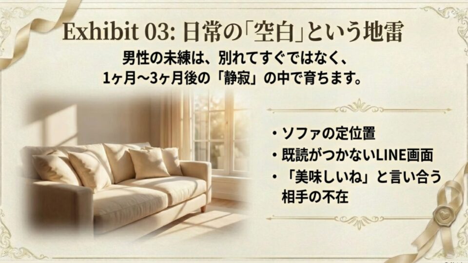 ふとした日常の隙間に、あなたの不在という「空白」を感じた時。彼は初めて、失ったものの大きさに気づきます。男性の未練は、別れてすぐよりも、1ヶ月、3ヶ月と経過した「静寂」の中で育っていくものなのです。