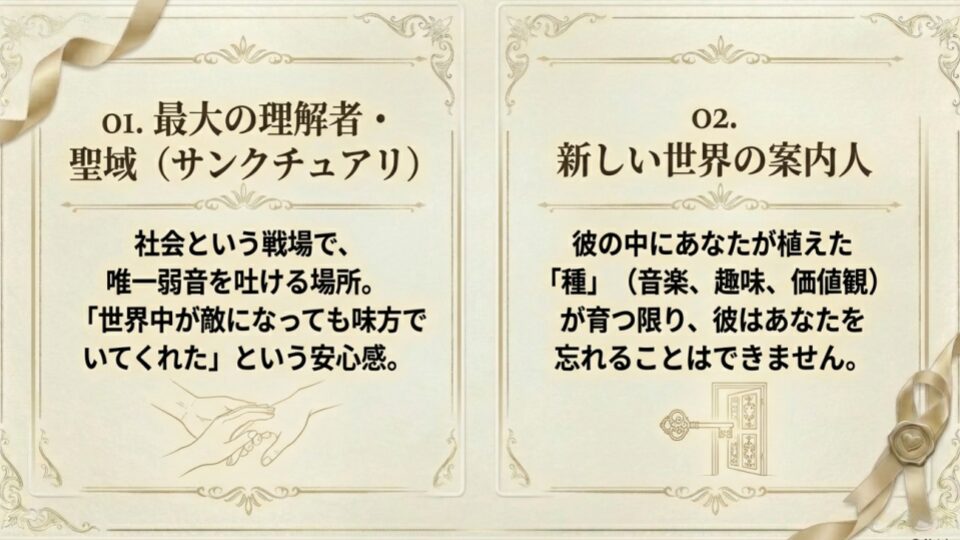 自分の欠点や弱さを受け入れ、「一番のアドバイザーであり、理解者」でいてくれた女性です。社会的なプレッシャーの中で生きる男性にとって、ありのままの自分を肯定してくれた記憶は、生涯消えることのない心の拠り所になります。