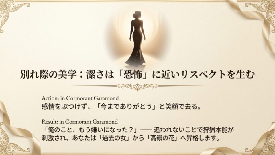 ここ、テストに出るくらい重要です(何の?)。別れ際にすがったり、感情をぶつけすぎたりせず、「今までありがとう」と笑顔で、あるいは静かに去っていった女性。男性はその「潔さ」に恐怖に近いリスペクトを覚えます。