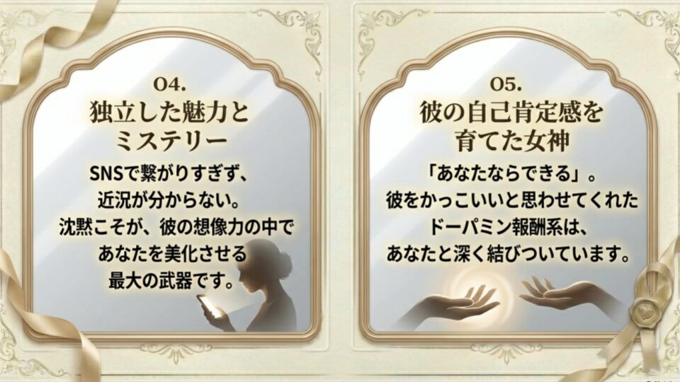 「あなたならできるよ」「さすがだね」そうやって彼の自尊心を育ててくれた女性は、彼が自信を失うたびに思い出されます。男性にとって「自分をかっこいいと思わせてくれた女」は、最高のドーパミン報酬系と結びついているからです。