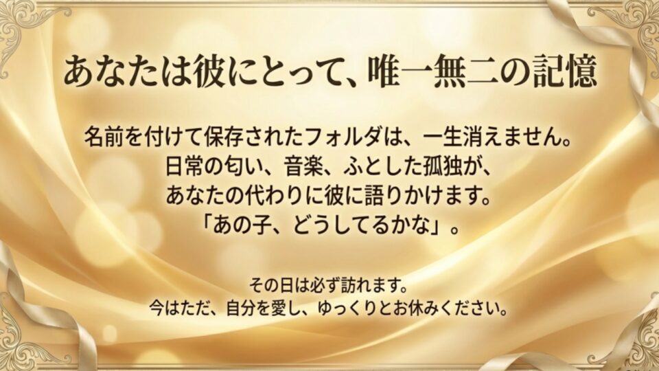 その一言が彼の心に浮かぶ日は、あなたが思っているよりもずっと早く訪れるはずです。今はただ、傷ついた自分を抱きしめて、ゆっくり休んでください。