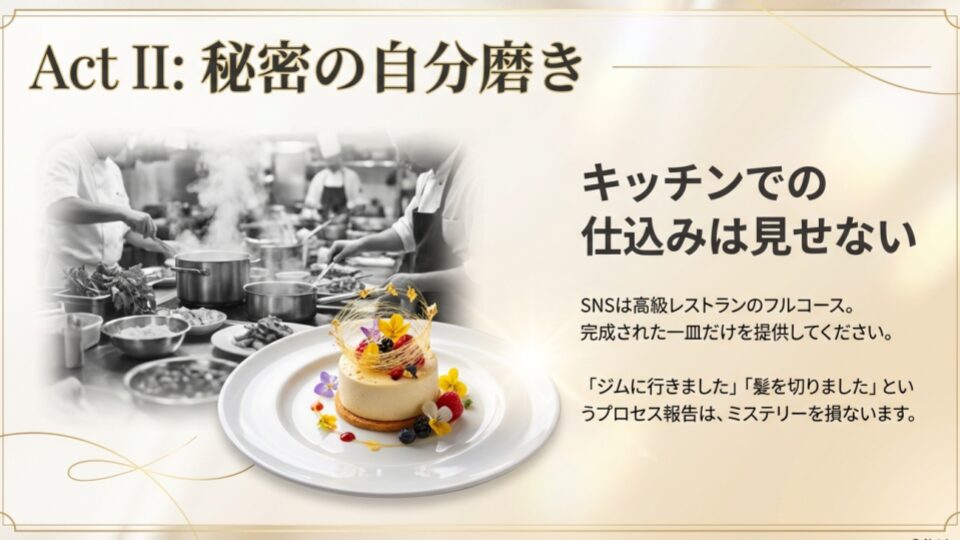 SNSは、高級レストランのフルコースのようなものです。キッチンでの必死な仕込み(自分磨き)は見せず、完成された最高の一皿だけを、不定期に提供するのがコツです。