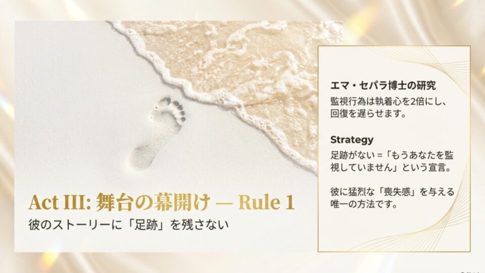 沈黙は、最大の武器。何も情報を与えないことで、彼は初めて「あれ、あいつ今どうしてるんだろう?」と、あなたの不在を実感し始めるのです。