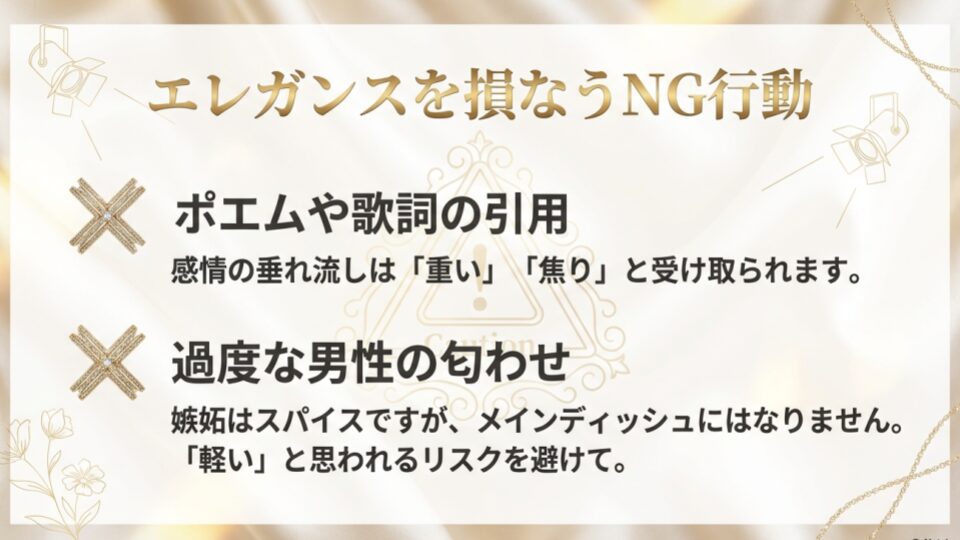 深夜のテンションで、切ない歌詞や意味深なポエムをストーリーに流すのは禁止です。27歳の女性がこれをやると、男性は「重い」「結婚に焦っている」と本能的に察知し、さらに距離を置きたくなります。