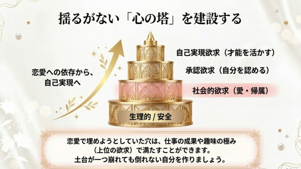 しかし、その上には「承認欲求(自分を認める)」、さらに頂点には「自己実現欲求(自分の才能を活かす)」があります。彼がいなくても、仕事で成果を出したり、趣味を極めたりすることで、ピラミッドの上の階層を満たすことは可能です。土台が1つ崩れても、他の柱で支えられる自分を作っていきましょう。