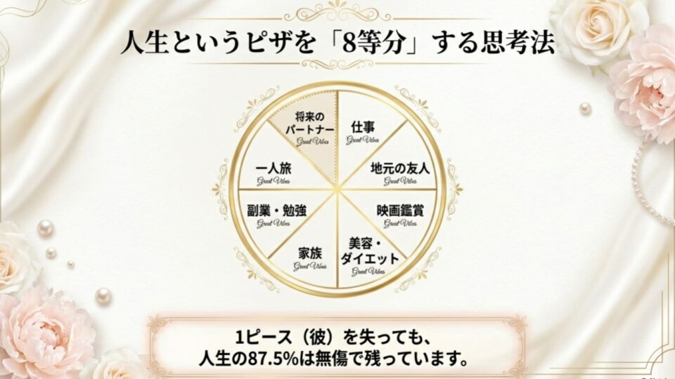 あなたの人生を、1枚の丸いピザだと考えてください。これまでのあなたは、8ピース全部を「彼」で埋めていました。だから、彼がいなくなった瞬間、ピザの箱は空っぽになり、あなたは「何もなくなった」と絶望したのです。