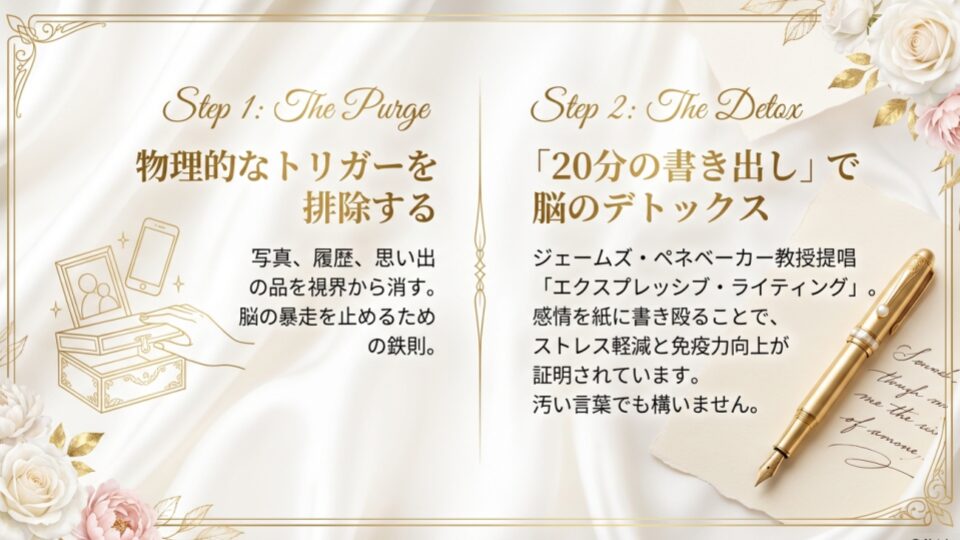 まず、脳の禁断症状を抑えるために、彼の残留思念(!)を消去します。写真、トーク履歴、プレゼント、彼のお気に入りのシャンプー。これらが目に入るたびに、脳はドーパミンを求めて暴れ出します。