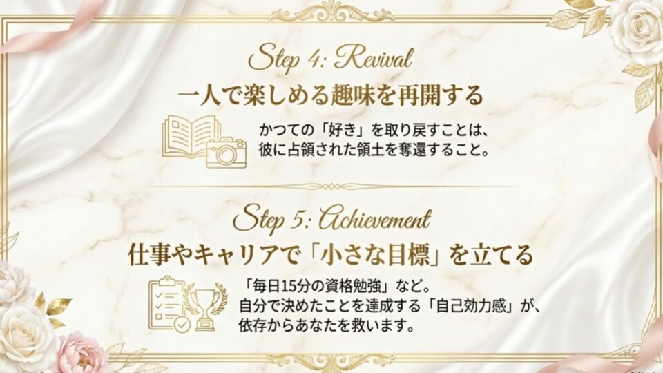 そんな些細なことで構いません。「自分で決めたことを、自分で達成した」という感覚(自己効力感)こそが、恋愛依存からあなたを救い出す強力な武器になります。