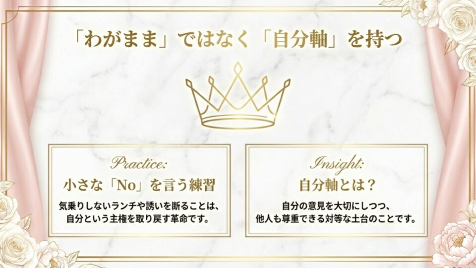 ランチで「みんなと同じでいい」と言うのをやめる。気乗りしない誘いに「行けたら行く(結局行く)」のをやめる。小さな「No」を積み重ねることは、自分という主権を取り戻すための革命です。