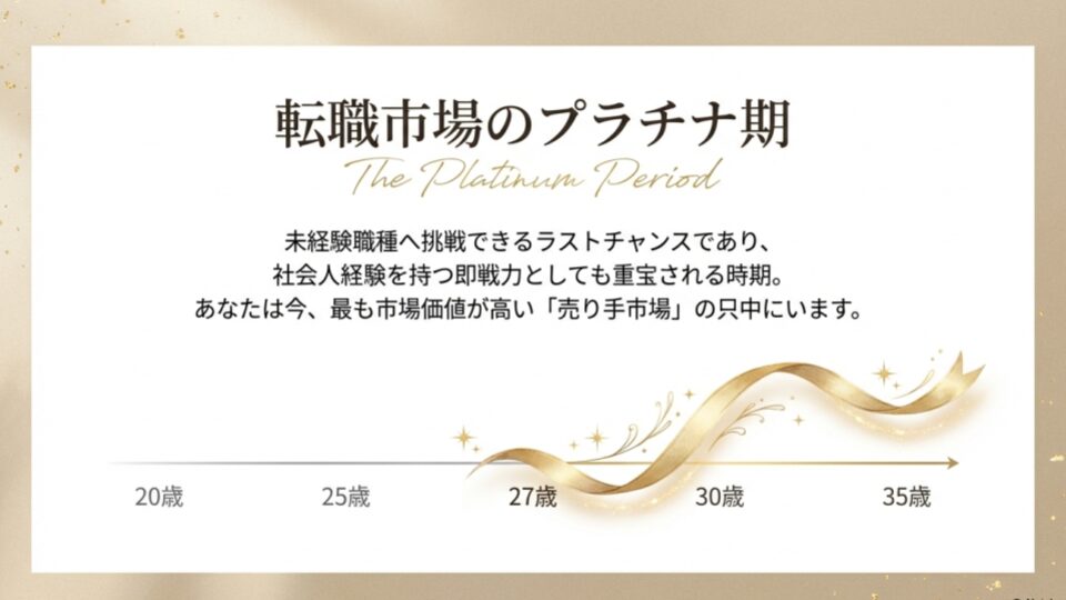 「27歳で転職なんて、もう遅いかな?」そんな不安があるかもしれません。でも、30代になってから「あの時動いておけば」と後悔する自分を想像してみてください。27歳は、未経験職種へ挑戦できるラストチャンスであり、同時にある程度の社会人経験がある「即戦力」として最も重宝される、転職市場のプラチナ期なんです。
