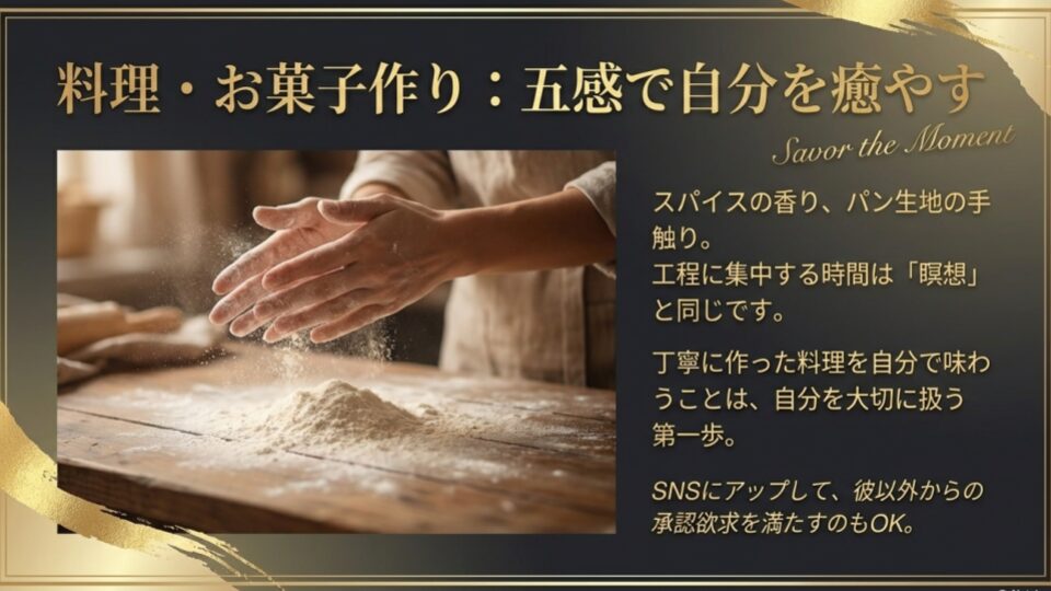 料理は、切る・煮る・焼くといった工程に集中するため、瞑想に近い効果があります。特におすすめは、手間のかかる「スパイスカレー」や「パン作り」。生地を捏ねる感触や、部屋に広がる香りが、五感を刺激してくれます。