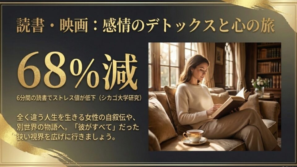 失恋した時こそ、あえてドロドロの悲劇や、逆に全く別世界のノンフィクションに触れてみてください。シカゴ大学の研究(2012年)では、読書を6分間続けるだけで、ストレス値が68%も軽減されることが示されています。