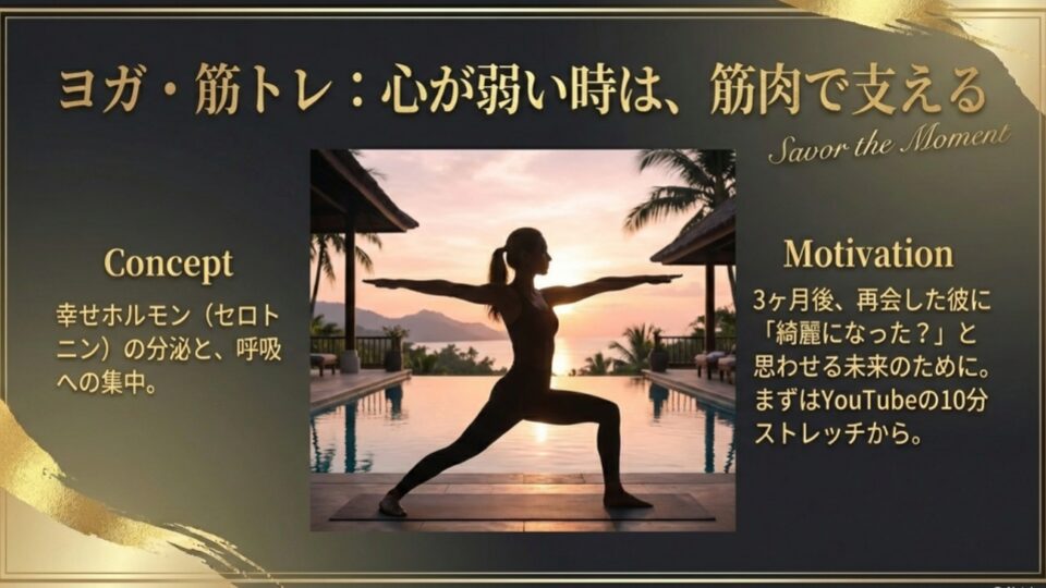 「心が弱っている時は、筋肉を鍛えろ」冗談のようですが、これは真理。運動をするとセロトニンやエンドルフィンといった多幸感をもたらすホルモンが分泌されます。特にヨガは、自分の呼吸に集中することで、散漫になった意識を今ここに戻してくれます。