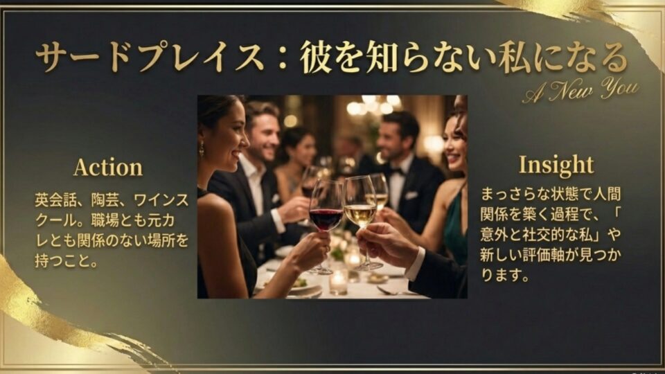 英会話、陶芸、ワインスクール。どんなものでも構いません。職場の人間関係や元カレとの共通の友人ではない「サードプレイス」を持つことが、27歳の心の安定には不可欠です。