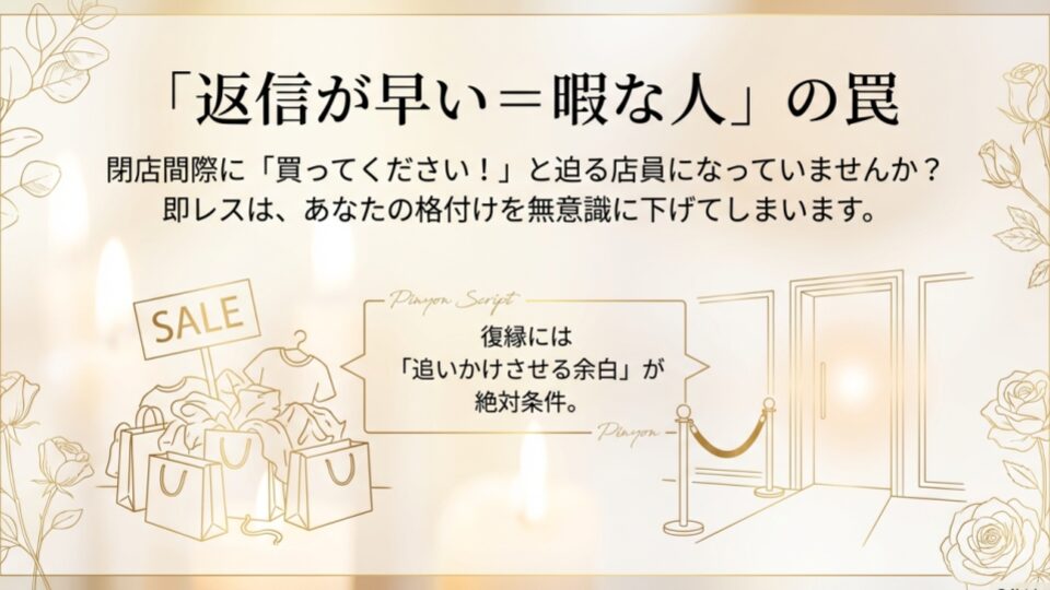 あなたが即レスを繰り返すと、彼は「あ、こいつはいつでも手に入るな」と無意識に格付けを下げてしまいます。復縁には「追いかけさせる余白」が絶対に必要なんです。