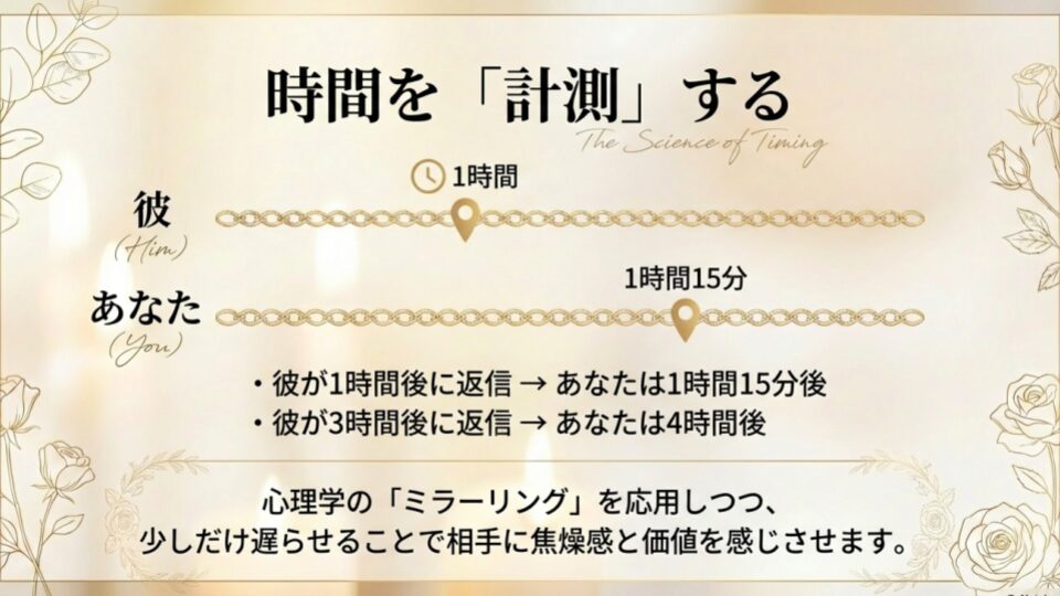 まず、直近の彼からの返信時間をチェックしてください。1時間後に来たなら、あなたは1時間15分後に返す。3時間後なら、あなたは4時間後。