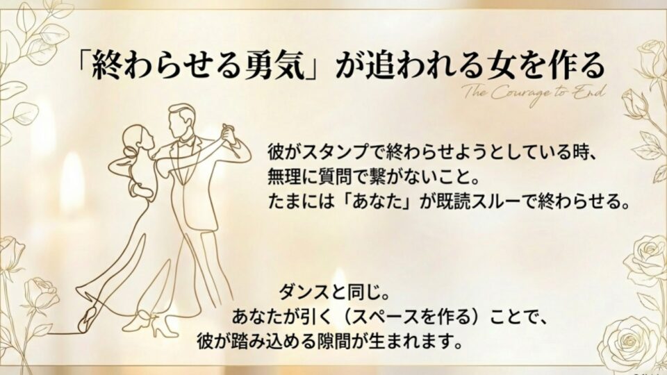ダンスでも、上手なパートナーは相手が踏み込みやすいように、あえて自分の足を引き、スペースを作りますよね。LINEも同じ。あなたが引くことで、彼が踏み込める隙間ができるのです。