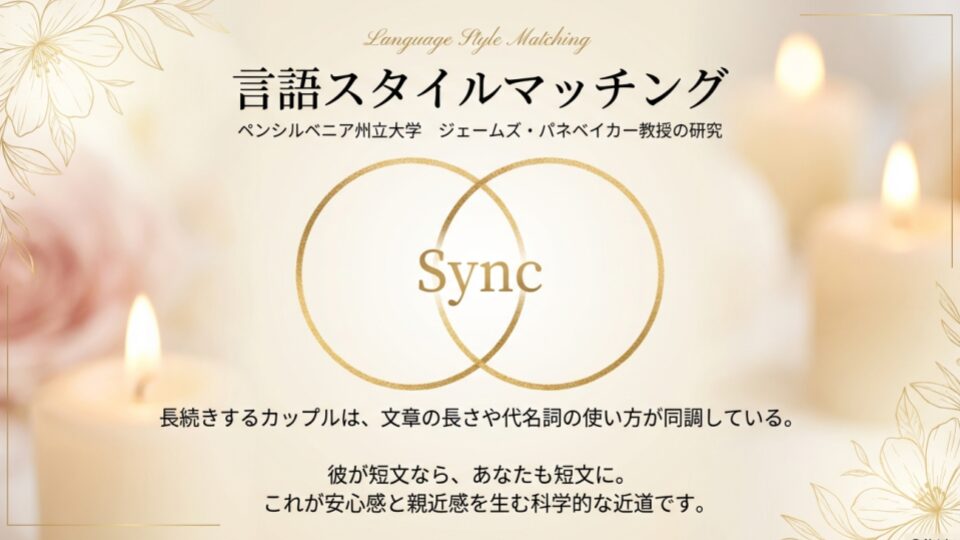 ペンシルベニア州立大学の心理学者ジェームズ・パネベイカー教授の研究(テキストマイニングによる対人関係分析)によれば、長続きするカップルは「代名詞の使い方や文章の長さが同調している」傾向にあります。これを「言語スタイルマッチング」と言います。彼が短いなら、あなたも短く。これが鉄則です。