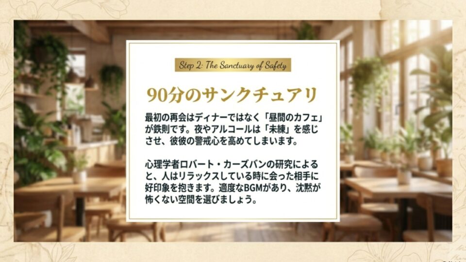 最初の再会は、ディナーではなく「昼間のカフェ」が鉄則です。なぜなら、夜のお酒の席は「下心」や「未練」を感じさせやすく、彼の警戒心を最大にしてしまうから。