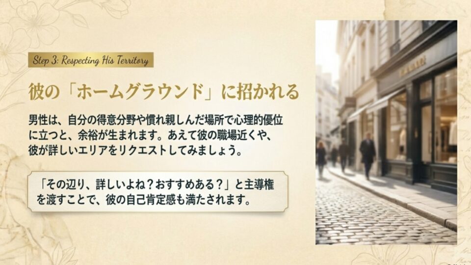 自分が行きたい場所ではなく、彼が「ホームグラウンド」だと感じるエリアを選ぶことも戦略の一つです。