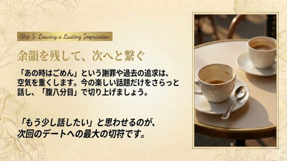 ここでは、今現在の楽しい話題や、彼が興味を持っていること、そしてあなたが新しく始めたこと(趣味や仕事)を、さらっと短文で伝えましょう。「話せて楽しかった。じゃあ、またね」腹八分目で切り上げるのが、次回のデートに繋げる最大のコツです。