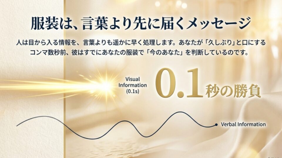人は目から入る情報を、言葉よりも遥かに早く処理します。あなたが「久しぶり」と口にするコンマ数秒前、彼はあなたの服装を見て「今のあなた」を判断しているのです。