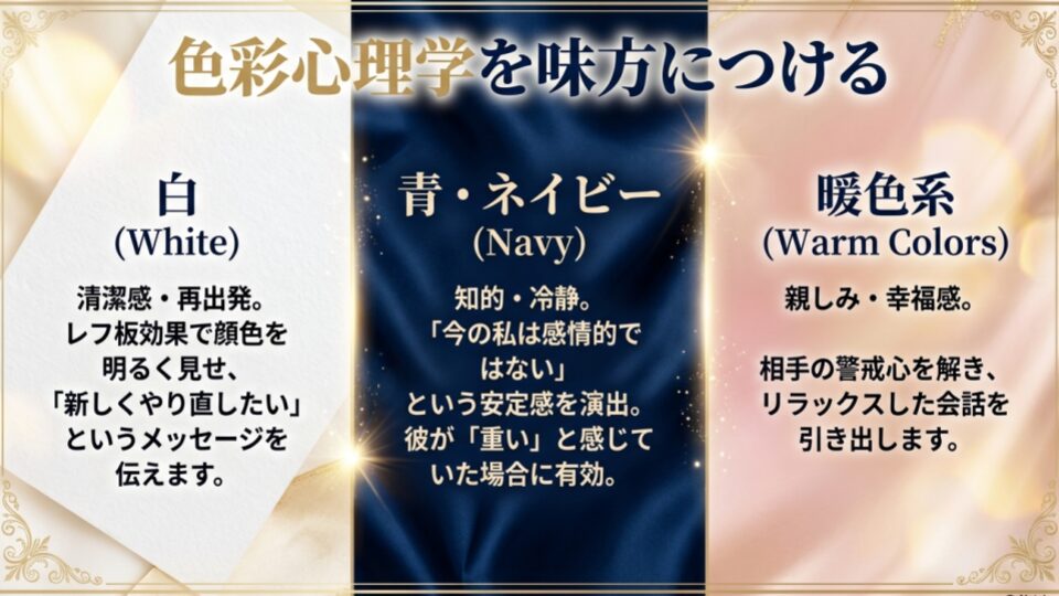 色には、相手の感情をコントロールする力があります。再会の場での「色選び」に迷ったら、以下の3つの戦略から選んでみてください。
