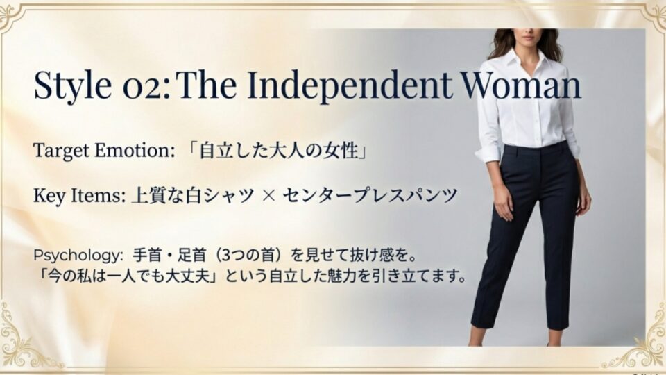 - ポイント:手首、足首を見せて抜け感を出すこと。甘さを抑えることで、「今の私は一人でも大丈夫」という自立した魅力を引き立てます。
