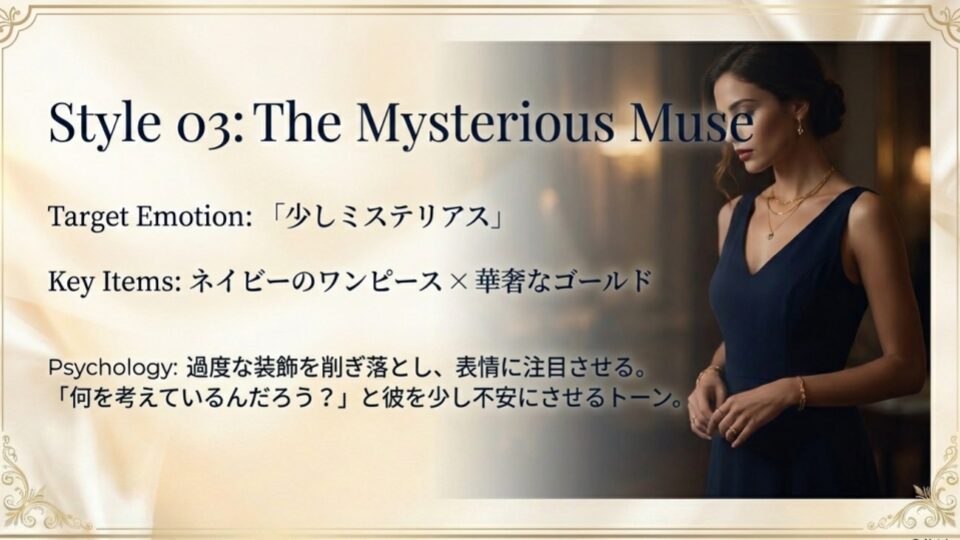 - ポイント:過度な装飾を削ぎ落とすことで、あなたの表情そのものに注目させます。「何を考えているんだろう?」と彼をちょっと不安にさせるくらいのトーンが理想的。