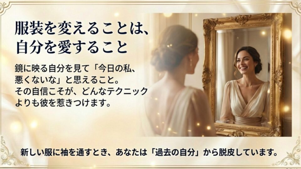 ここまで服装について語ってきましたが、一番大切なことを伝えますね。鏡に映る自分を見て「よし、今日の私、悪くないな」と思えること。その自信こそが、どんなテクニックよりも彼を惹きつけます。