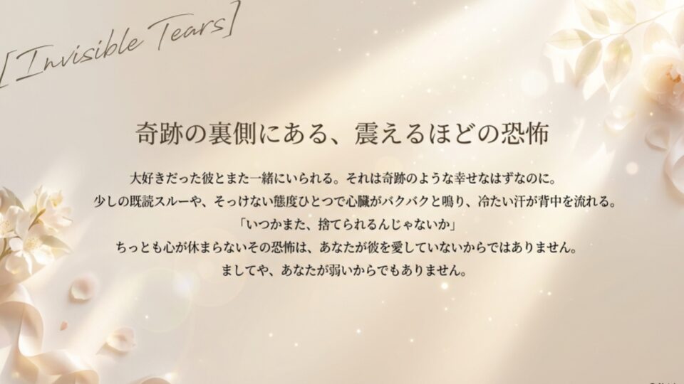 3日前、あなたはそんな思いでスマホの画面を眺めていたかもしれませんね。あるいは、あんなに望んでいた彼との再会を果たしたのに、心の中は「いつかまた捨てられるんじゃないか」という恐怖で支配されているのかもしれません。