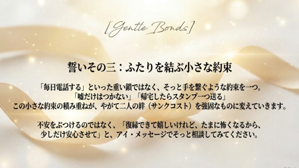 小さな約束の積み重ねは、心理学における「サンクコスト(費やした時間や労力)」となり、二人の関係をより強固なものに変えていきます。