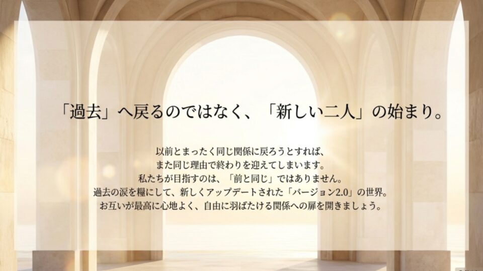 「前と同じ」を目指すのは今日で終わりにしましょう。あなたが目指すべきは、過去の失敗を糧にした「バージョン2.0」の新しい関係です。(最新のiPhoneを買ったのに、中身が初期のガラケーだったらガッカリしますよね?)