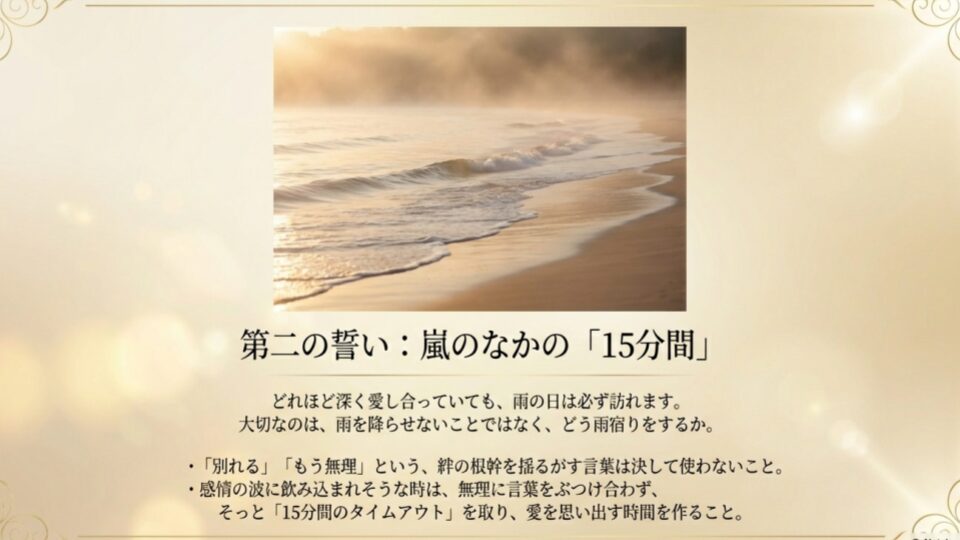 どれだけ愛し合っていても、意見の相違は必ず起きます。大切なのは、喧嘩をしないことではなく「どう終わらせるか」です。「別れる」「もう無理」といった、関係の根幹を揺るがす言葉をNGワードに設定しましょう。また、「冷静になれない時は15分間のタイムアウト(一時中断)を取る」といった、物理的な回避策を持っておくのが効果的です。