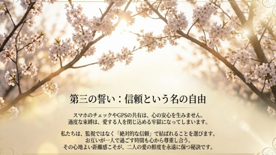 スマホをチェックする、GPSを共有する……。不安な時はそうしたくなりますが、これは信頼の貯金を切り崩す行為です。ルールは「監視」のためではなく、「安心」のために作りましょう。「異性と二人で飲む時は事前に伝える」「週に一回は、スマホを置いて一人の時間を作る」といった、適度な距離感が二人の鮮度を保ちます。