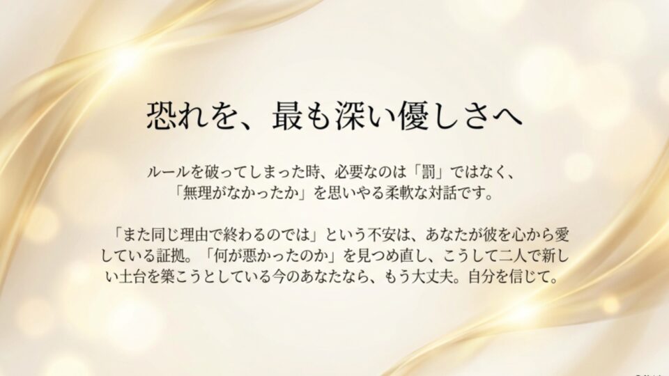 今のあなたは、失う怖さを知っています。その怖さは、相手を大切にするための「優しさ」に変えることができます。「前と同じ」を繰り返さないためには、勇気を持って「言葉」にすること。曖昧にせず、逃げずに、二人でルールを作り上げること。