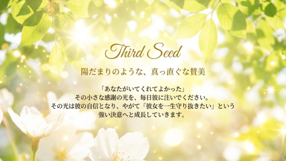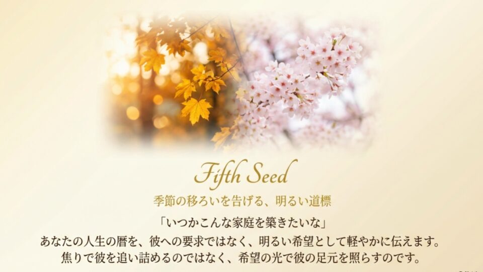 厳しいようですが、種を蒔き、環境を整えても、どうしても芽が出ない(結婚の意思がない)男性は存在します。その時は、あなたが蒔いた種を回収し、別の肥沃な大地(新しい縁)へ移動する勇気も必要です。