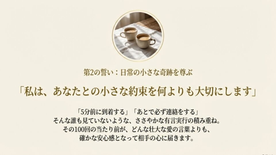 信頼が芽生えるのは、大きな愛の言葉を囁いた時ではありません。誰も見ていないような「小さな約束」を守り抜いた瞬間です。