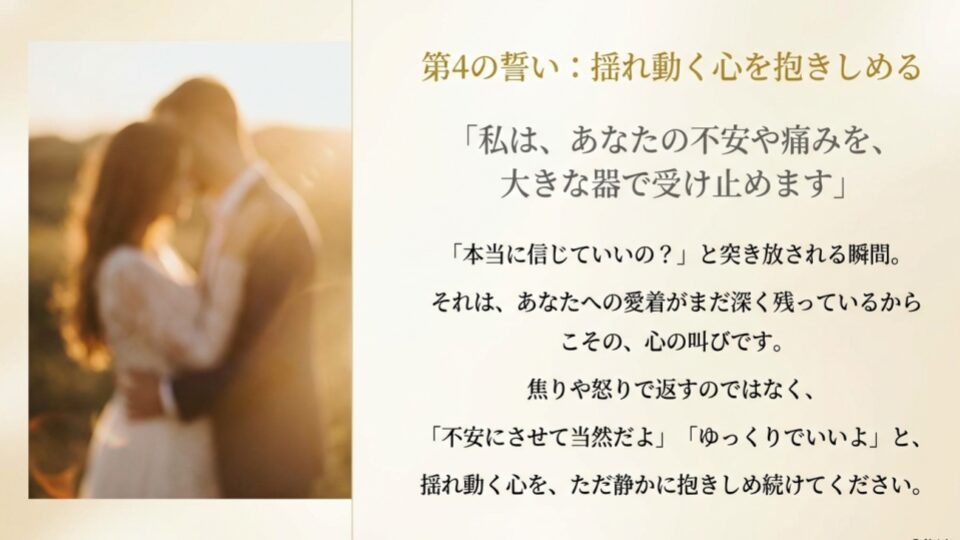信頼回復の期間は、いわば「徳を積む修行期間」です。相手がどう思うかではなく、自分がどう在りたいかに集中しましょう。誠実であることは、彼のためではなく、あなた自身が胸を張って生きるために必要なのです。