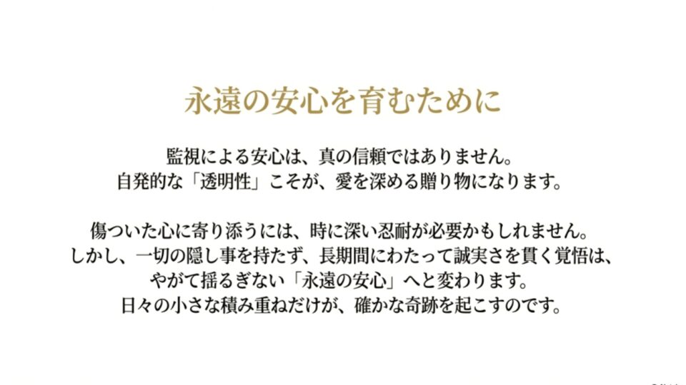 - OK返答: 「不安にさせてごめんね。そう思うのは当然だと思う」「時間がかかってもいいから、少しずつ証明させてほしい」