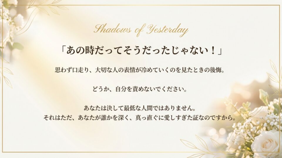 過去は変えられません。でも、その過去を「今の自分を苦しめる狂器」にするか、「これからの関係を良くするための教訓」にするかは、あなた自身が選べます。
