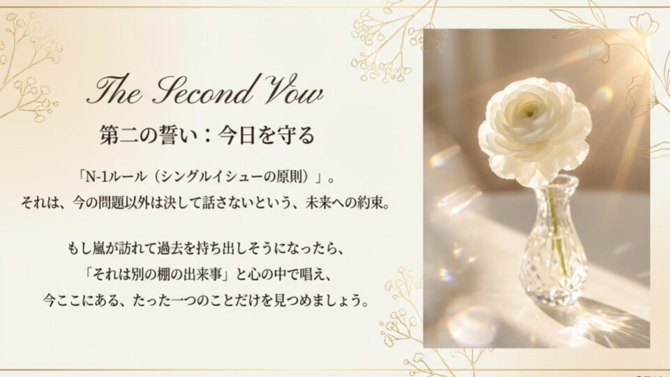 過去を持ち出しそうになったら、「それは別の棚の話」と心の中で唱えてください。一つの喧嘩で扱っていい議題は一つだけ。これを「シングルイシュー(単一争点)の原則」と呼びます。