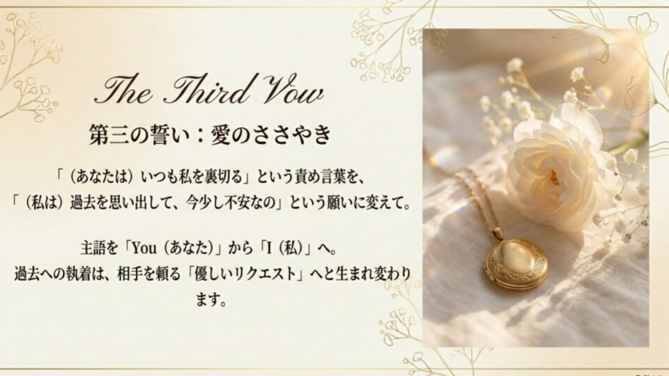 許せないのは、まだあなたの中に「納得感」が足りないからです。無理に許そうとせず、「今はまだ癒えている途中だ」と認めましょう。ただし、それを相手への攻撃に使うのは逆効果。自分の不安を「過去を責める」形ではなく、「今の私を安心させてほしい」という具体的なリクエストとして伝える練習をしてください。