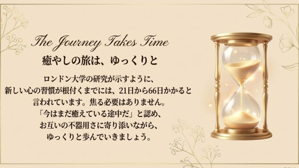 心理学的には、新しい思考の癖が定着するまでには約21日から66日かかると言われています(ロンドン大学の研究など)。まずは3週間、意識的に「今の問題以外は口にしない」ことを意識してみてください。最初は苦しいですが、少しずつ脳の回路が書き換わり、過去に囚われない自分になれるはずです。