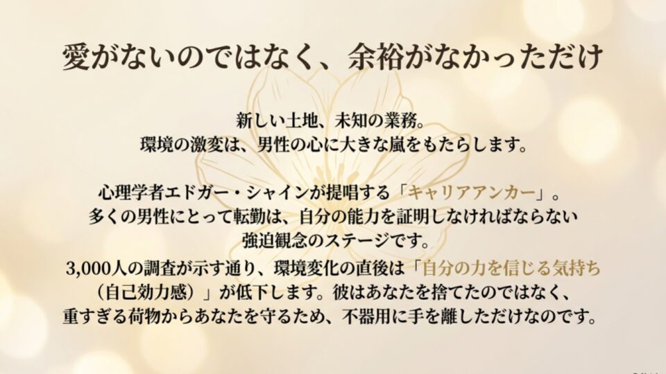 ある調査(被験者3,000人のビジネスマンを対象とした動機付け研究)では、環境変化の直後は「自己効力感(自分の力を信じる気持ち)」が一時的に低下することが示されています。今の彼は、あなたを愛する自信すら失っている状態なのです。