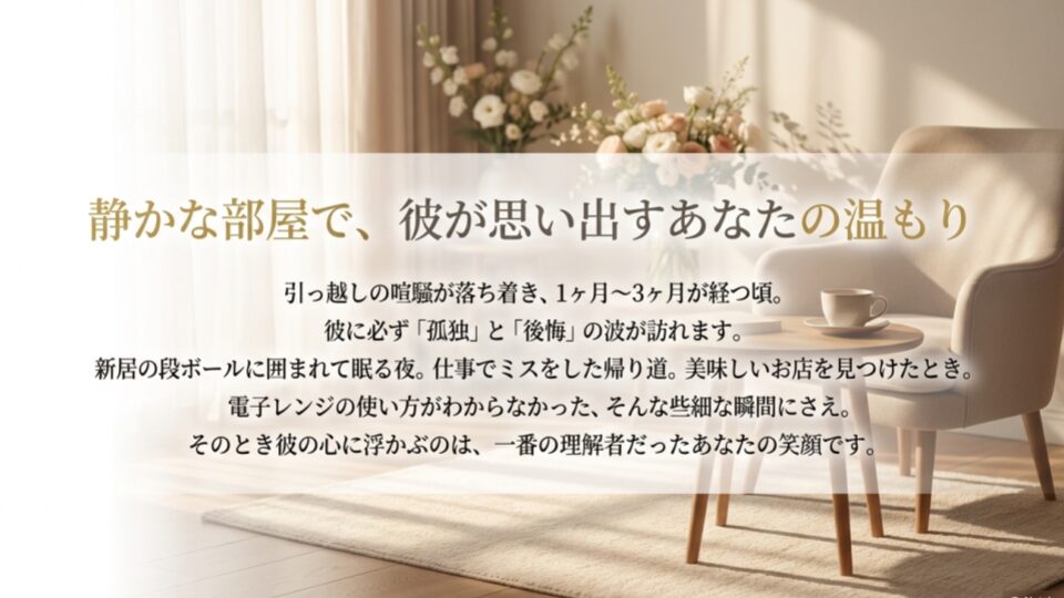 この時期に無理に連絡を取ろうとしても、彼は自分の決断を正当化するために、さらに殻に閉じこもってしまいます。今は、彼を「寂しさの入り口」まで歩かせてあげる時間が必要です。