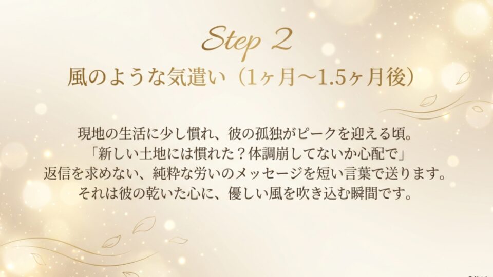転勤から1ヶ月〜1.5ヶ月後。現地の生活に少し慣れ、ふと冷静になったタイミングがチャンス。「新しい土地には慣れた?体調崩してないか心配で」という、短く、返信を求めない労いのメッセージを送ります。